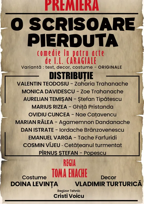 „O scrisoare pierdută” de I.L. Caragiale, piatra de temelie a comediei românești, renaște pe scenă într-o montare care păstrează cu sfințenie spiritul original al capodoperei. Această premieră nu aduce modernizări, reinterpretări sau artificii contemporane: decorurile, costumele și atmosfera sunt redate cu aceeași noblețe și autenticitate care au fascinat generații întregi.