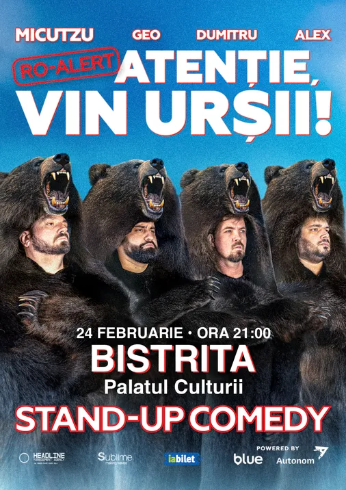 Bilete Bistrita: Stand-up Comedy cu Micutzu, Geo Adrian, George Dumitru si Alex Ionita - RO ALERT - “Atentie, vin ursii!" - SHOW 2 - 24 feb, ora 21:00 - Palatul Culturii Bistrita