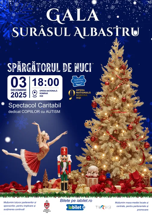 Seara va fi încununată de spectacolul extraordinar „Spărgătorul de Nuci” de Piotr Ilici Ceaikovski, prezentat de Opera Națională Română din Iași – un spectacol clasic, plin de magia Crăciunului, care aduce pe scenă personaje îndrăgite, decoruri de poveste și emoția unei lumi în care visele devin realitate.