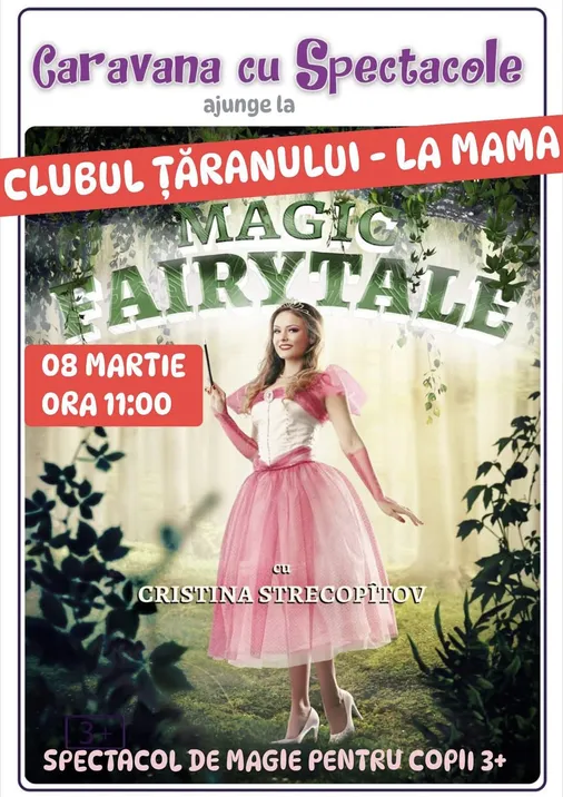 O călătorie în minunata poveste a Zânei Magice. Cei mici și cei mari se vor bucura de un spectacol interactiv plin de energie și de voie bună, pentru că “Magic FairyTale” este locul unde copiii urcă pe scenă și devin mici magicieni. Ca într-o adevarată vrajă, doar cu o baghetă fermecată, ei învață trucuri hazlii și formule magice ce vor transforma fanteziile în realitate, pentru că în lumea poveștilor, totul este permis!