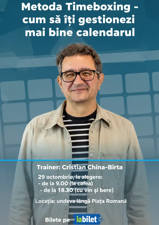 București, 22 octombrie 2025 — Cristian China-Birta organizează pe 29 octombrie un workshop dedicat metodei TIMEBOXING, un instrument practic pentru gestionarea mai eficientă a timpului și a calendarului personal sau profesional. Participanții pot alege să participe la una dintre cele două sesiuni:
