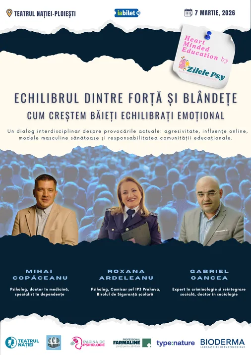 Conferința ''Echilibrul între Forță și Blândețe - Cum creștem băieți echilibrați emoțional'' aduce în prim-plan perspectiva integrată a specialiștilor din psihologie, criminologie, siguranță școlară și intervenție în comportamentul agresiv, pentru a oferi instrumente reale părinților, profesorilor și tuturor celor implicați în educație.