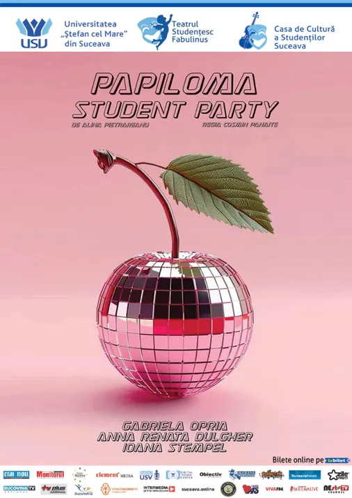 Marți, 9 Decembrie 2025, de la ora 19.00, va avea loc la sala Auditorium „Joseph Schmidt” a USV a opta reprezentație a spectacolului Teatrului Studenţesc Fabulinus, ,,Papiloma Student Party", de Alina Pietrăreanu, regia Cosmin Panaite.